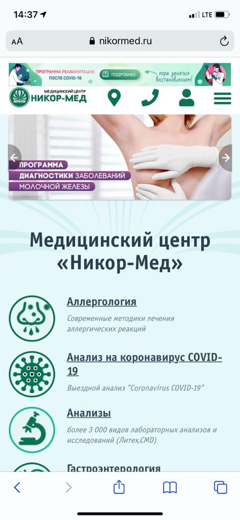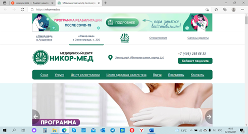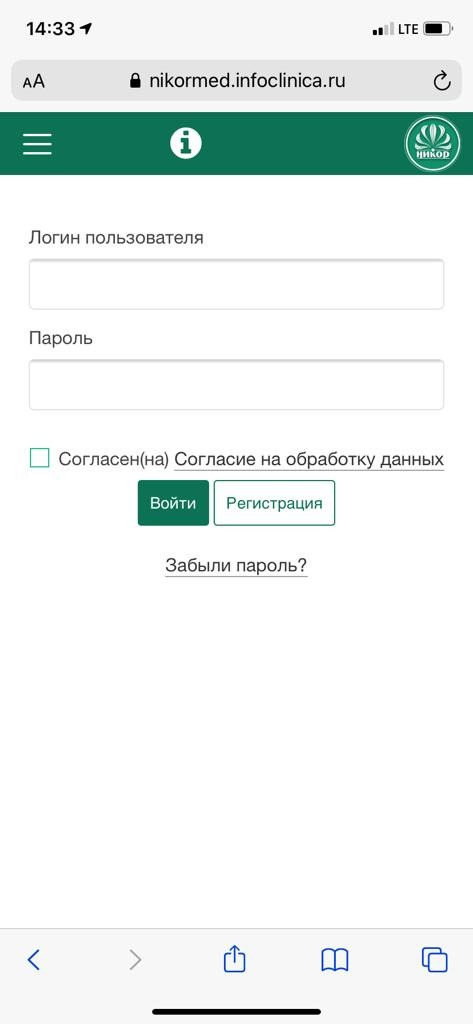 1. Вход через наш сайте https://nikormed.ru/ — в верхней панели кнопка «КАБИНЕТ ПАЦИЕНТА» ведет на портал https://nikormed.infoclinica.ru/