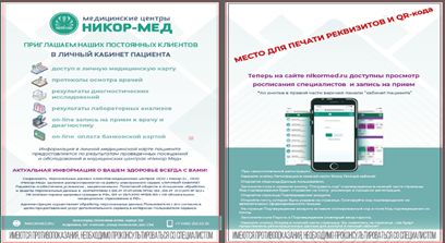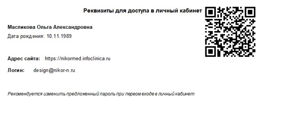 - Через считывание QR-кода телефоном , который предоставляется в ПРИГЛАШЕНИИ при регистрации пациента руками администратора подает сразу в «ЛИЧНЫЙ КАБИНЕТ ПАЦИЕНТА» на портал https://nikormed.infoclinica.ru/