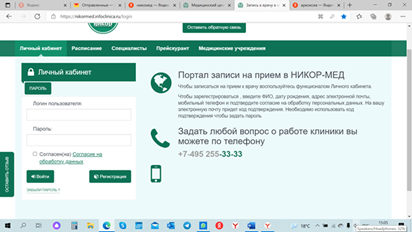 Вход в личный кабинет https://nikormed.ru в верхней панели кнопка «КАБИНЕТ ПАЦИЕНТА» или значок Человечка ведет в «ЛИЧНЫЙ КАБИНЕТ ПАЦИЕНТА» на портал https://nikormed.infoclinica.ru.