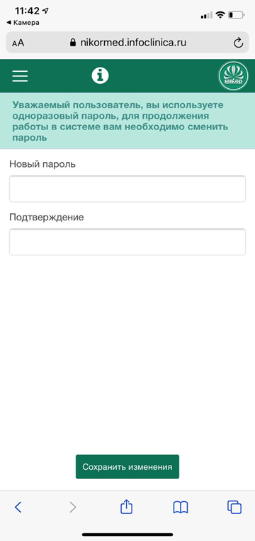 - Далее пациент попадает на страницу, где ему предлагается сменить одноразовый пароль
