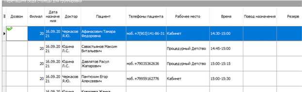 - В отчете «Просмотр расписания в таблице» — в столбце «ДОЗВОН» установка галочки после осуществления дозвона позволит снять красный телефончик в расписании и указать, что дозвон совершен.