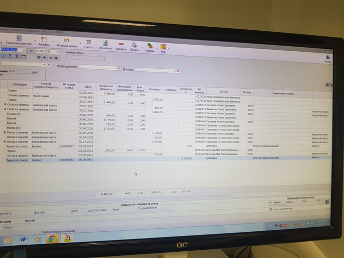 - Расписание -Лечение- Счет (справа в столбце при налчии предоплаты)