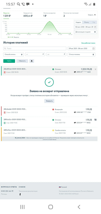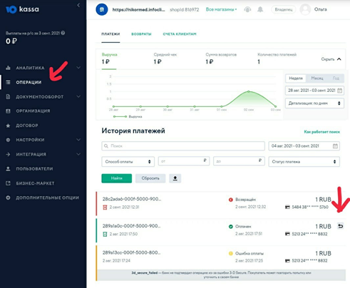 Для успешных платежей (выделены зеленым) можно осуществить возврат – для этого нажать на стрелочку возврата справа от суммы платежа.