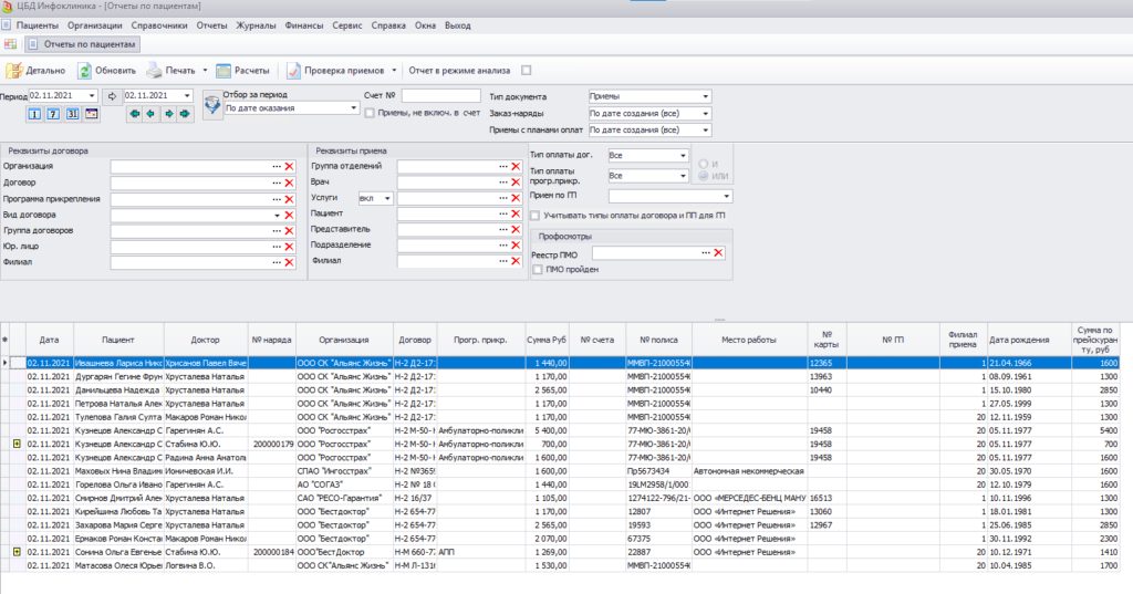 Формирование реестра услуг по каждой страховой компании за отчетный период (реестр формируется по страховым пациентам, которые физически посетили филиал , отдельно по пациентам , прикрепленным к другому филиалу)