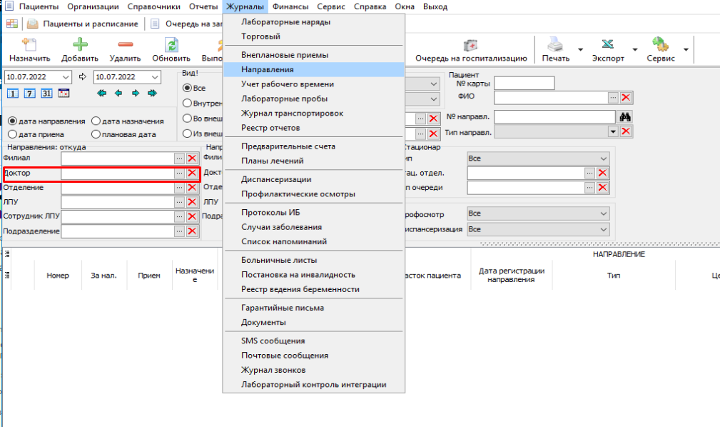Внутри журнала есть различные фильтры, в т.ч. по периоду направления, а также по доктору, кто сделал направление.
