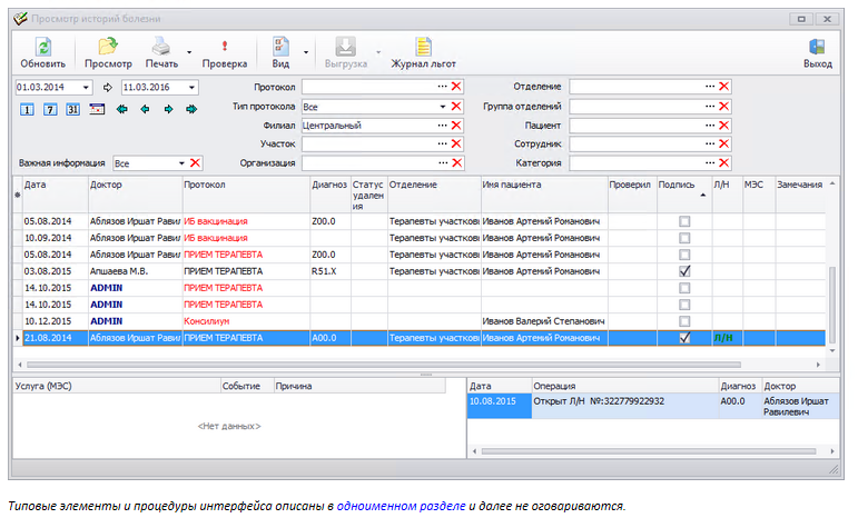 По умолчанию журнал содержит протоколы ИБ за текущую дату. Панель фильтров позволяет отобрать протоколы практически в любом сочетании, в т.ч. по пациенту (т.е. просмотреть его карту). Доступ к журналу открывается по правам доступа (в частности, он может открыт для каждого врача). Другое применение данного журнала — контроль за работой врачей (в т.ч. работа с замечаниями).