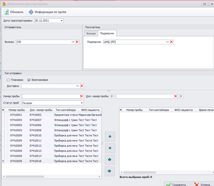 2.В окне Добавление транспортировки выберите, куда будет отправлен биоматериал, а также пробы, которые должны быть отправлены