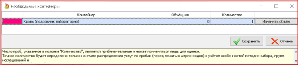 Обратите внимание: если для пациента формируется два и более наряда, в которых содержатся услуги с одинаковым биоматериалом и одинаковыми контейнерами, биоматериал по всем этим нарядам может быть предложено забрать в один контейнер.