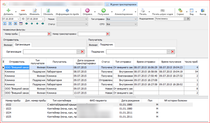 4.Нажмите кнопку Сохранить в нижней части диалогового окна Добавление транспортировки. Окно будет закрыто, вы вернетесь в журнал транспортировок. Выбранные пробы будут добавлены в таблицу транспортировок.