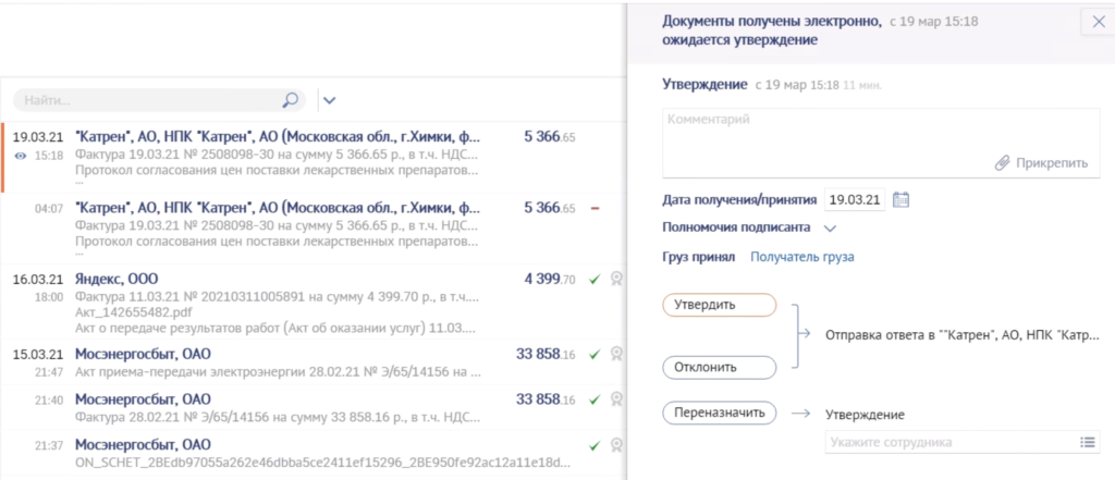 Чтобы утвердить факт поставки и закрыть документооборот, необходимо нажать кнопку «Утвердить» и подтвердить свое действие, нажав «Утвердить» в следующем контекстном меню.