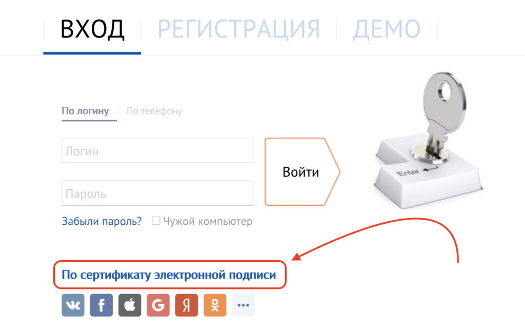 Чтобы войти в систему, необходимо нажать кнопку «По сертификату электронной подписи«