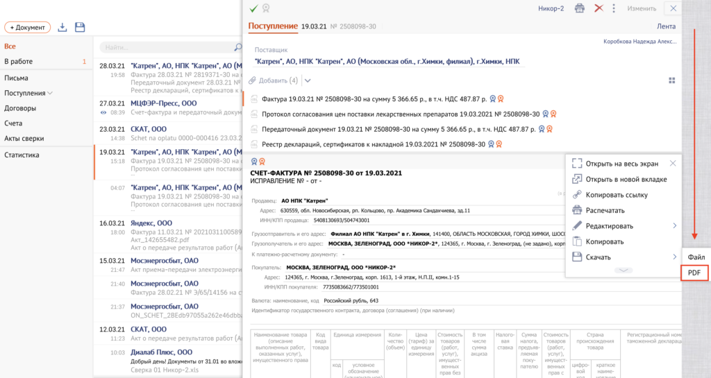 Чтобы скачать PDF, необходимо выбрать соответствующий пункт в дополнительном меню счета-фактуры: Скачать > PDF