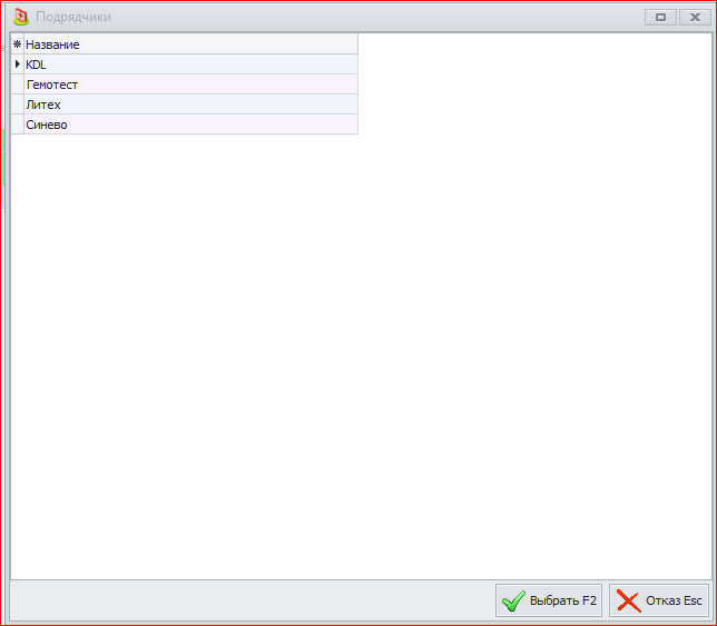 •Подрядчику – позволяет отметить, что проба отправлена подрядчику . при этом появится окно, в котором нужно выбрать соответствующую лабораторию